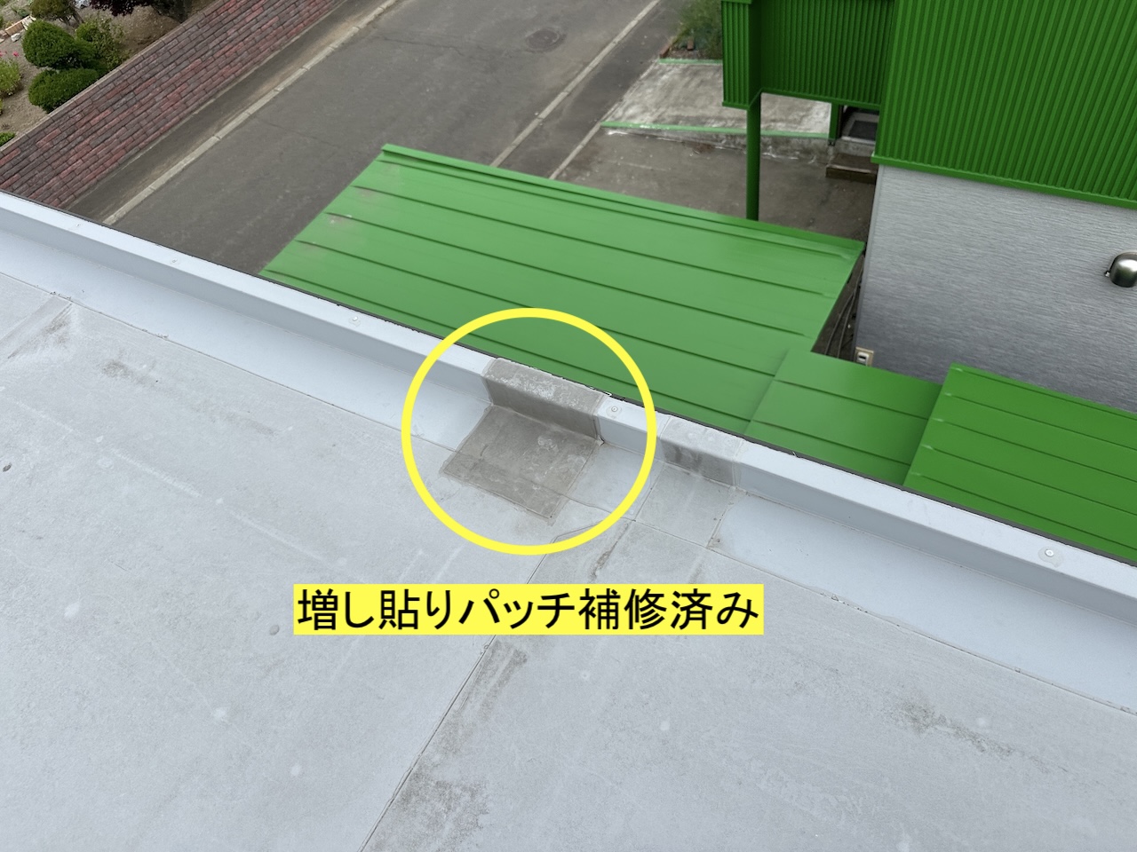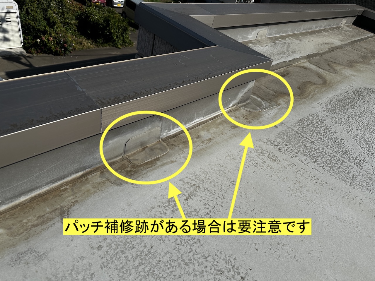 - 経年劣化による防水シートの亀裂での雨漏りが多いですが、一時的にパッチ補修で対応可能な場合もございます。