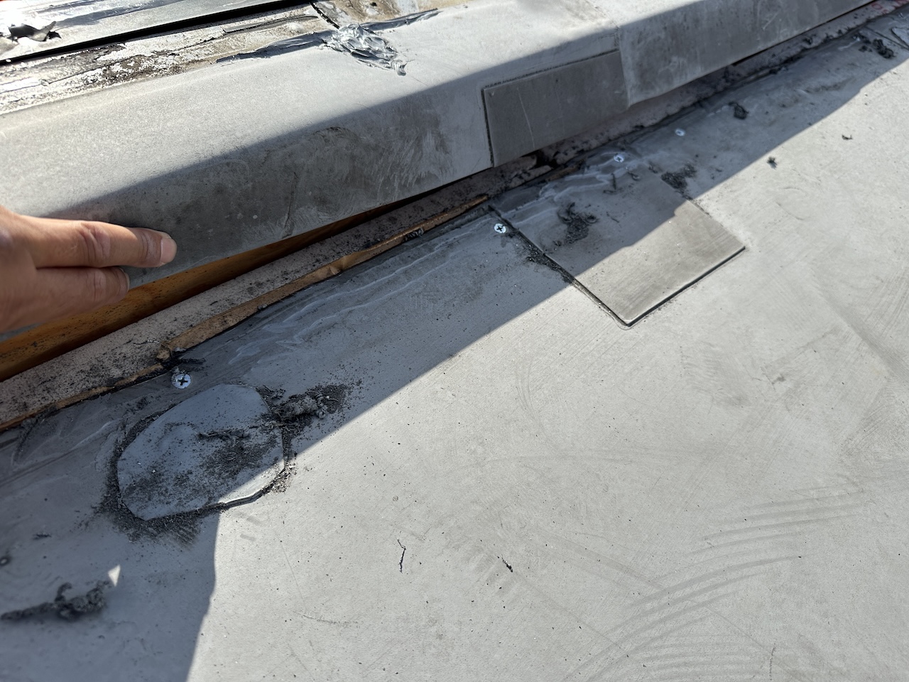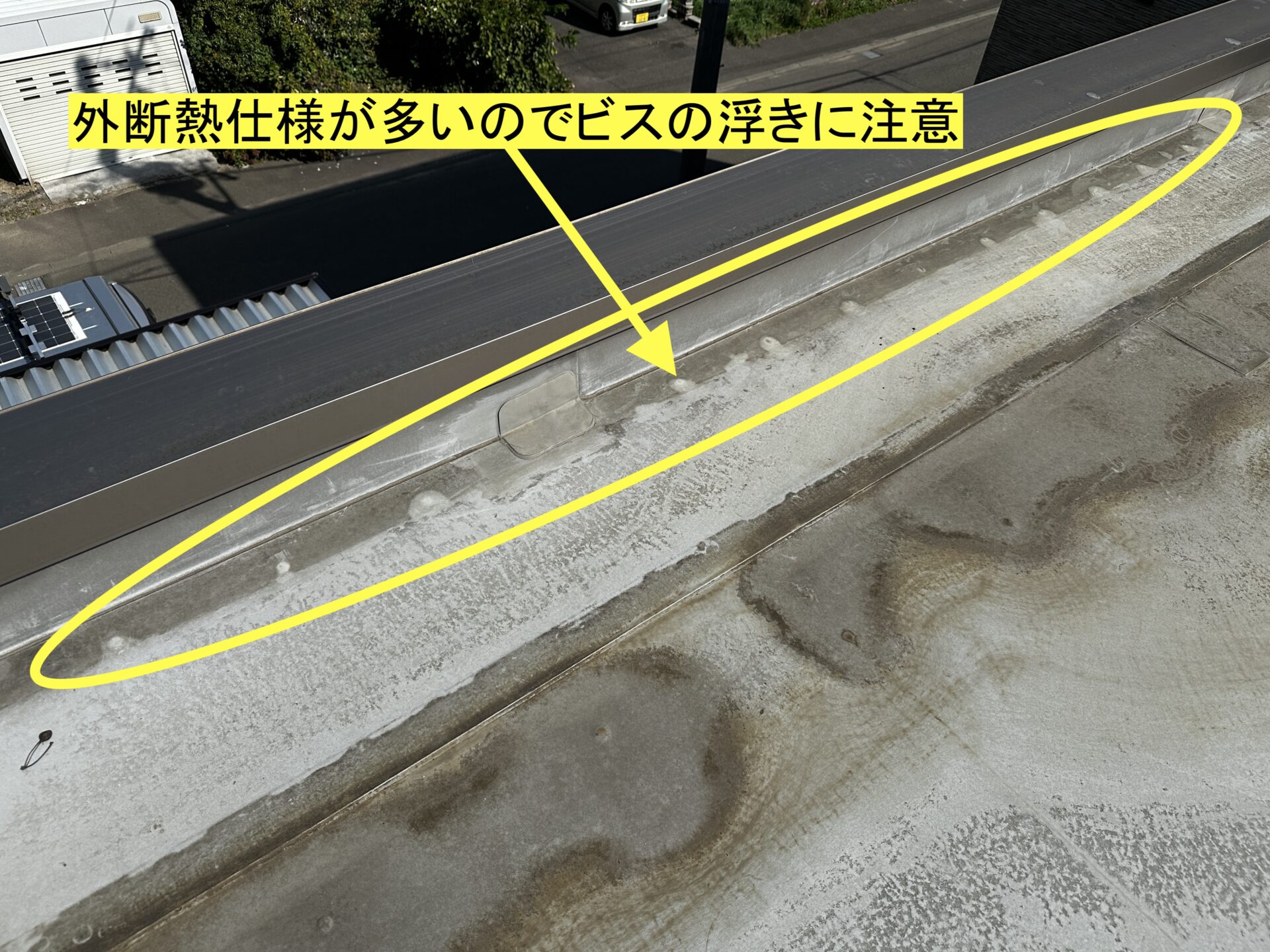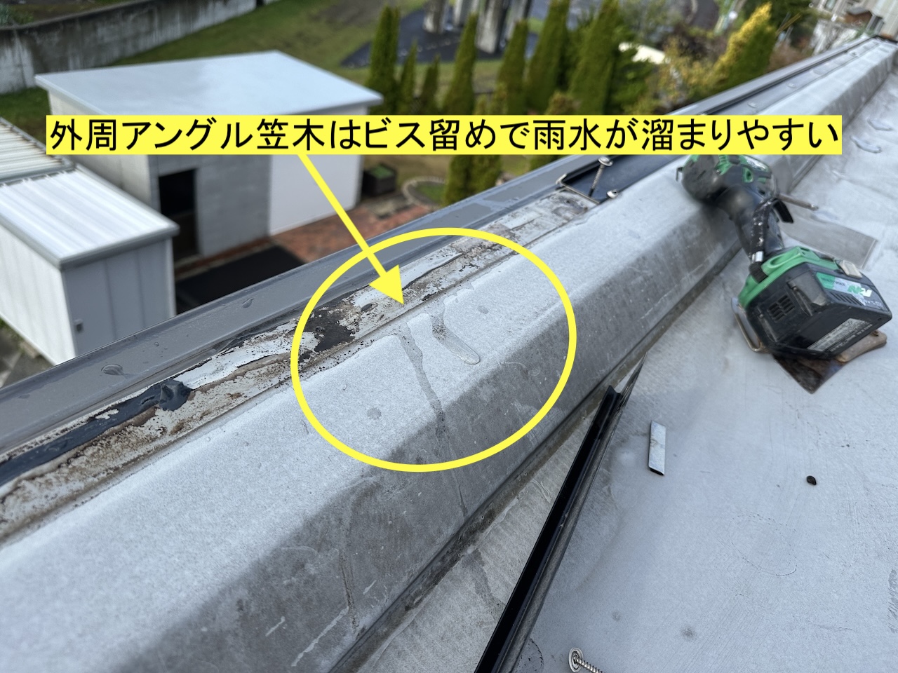 - 外周アングル笠木(ビス留め)まわりは要注意。ビス頭・継ぎ目・段差に水が溜まり、ビスの浮きがあると漏水に繋がる危険性もあります。