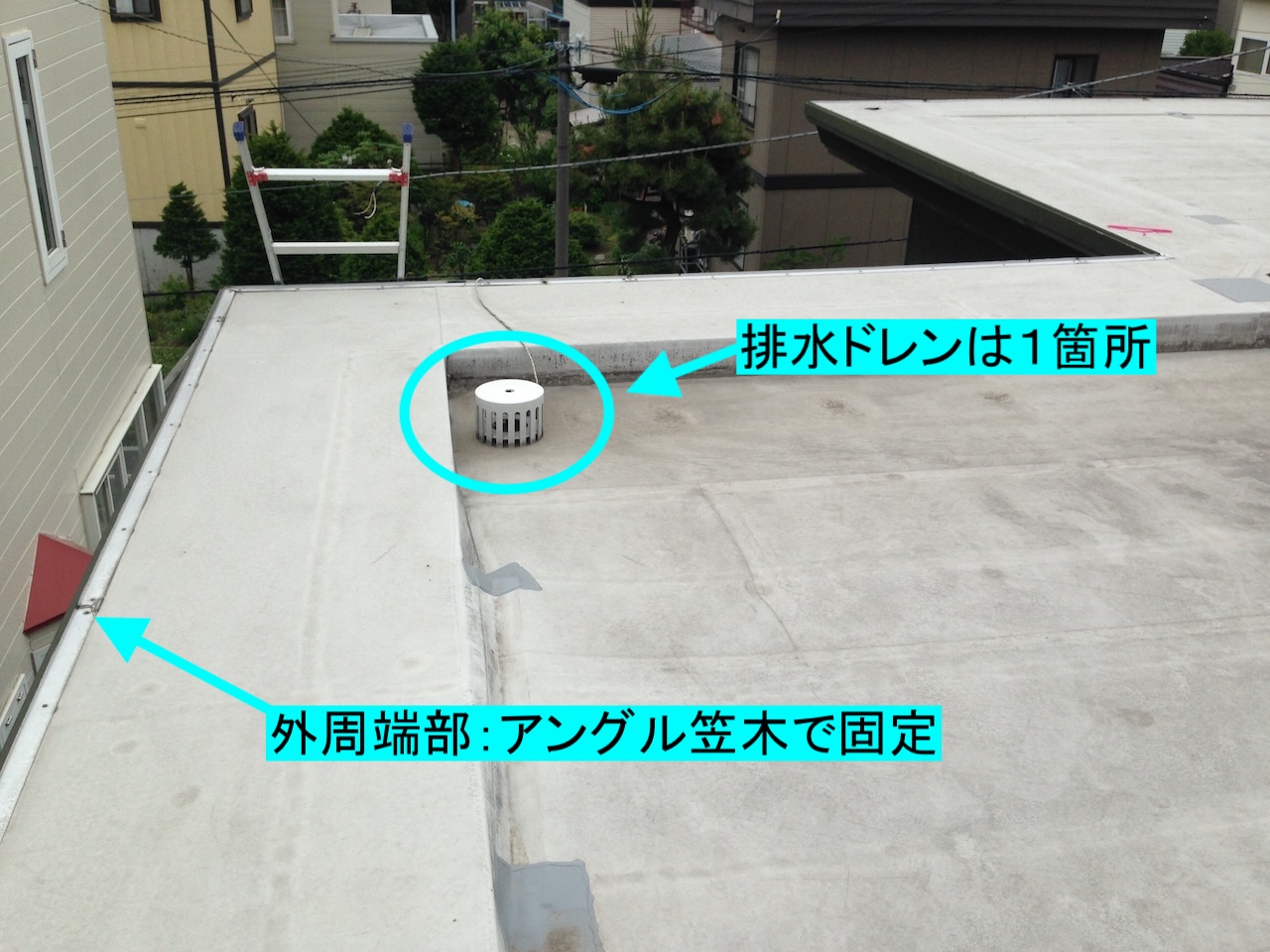 - 排水ドレンが基本1箇所で、外周端部はアングル笠木で固定されている