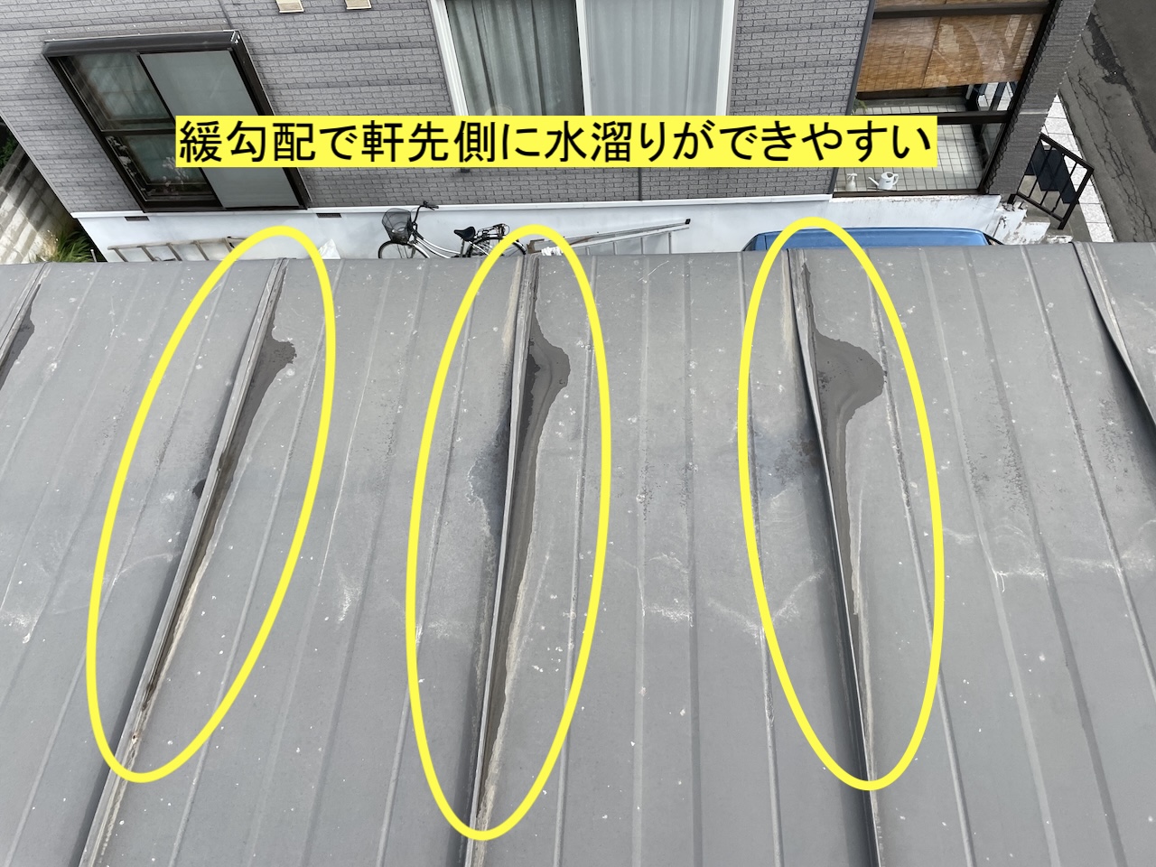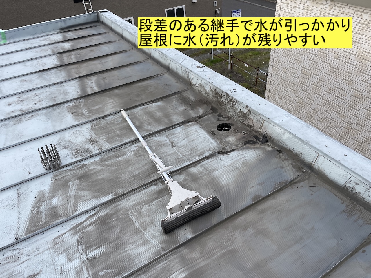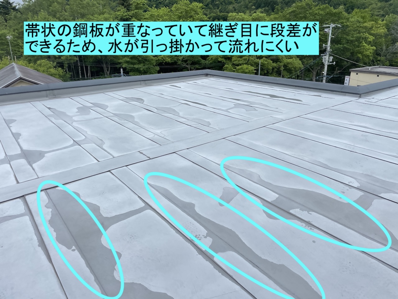 - 帯状鋼板(重ね貼り)の継ぎ目に段差ができやすく、雨水が引っ掛かって流れにくい