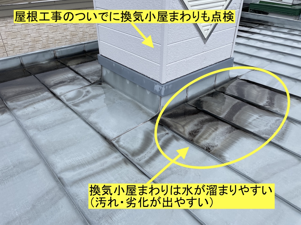 - 換気小屋(立ち上がり)まわりは水が回りやすく、汚れ・劣化が集中しやすいので要チェック