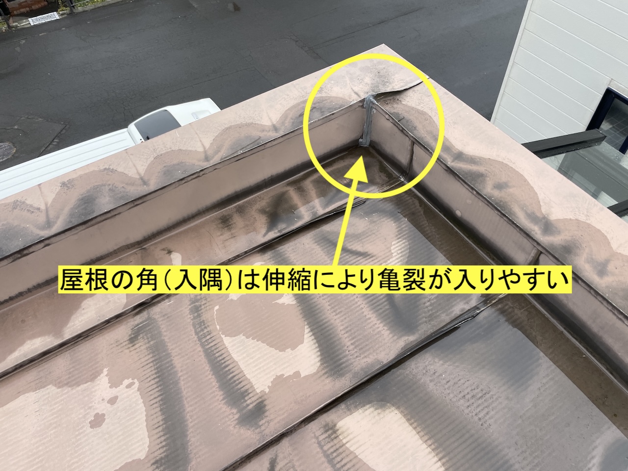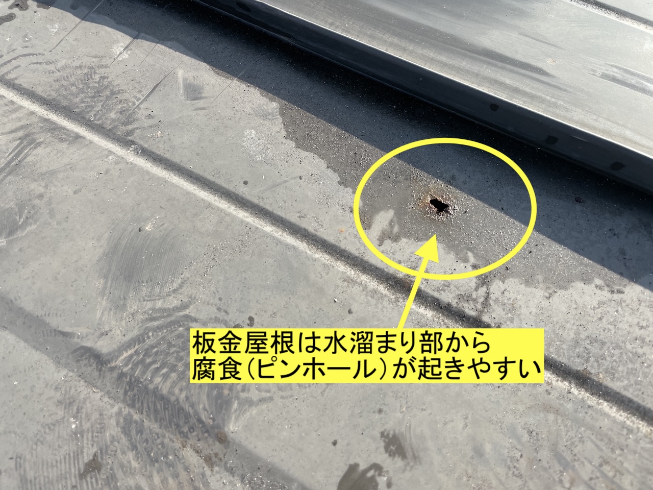- 水が溜まりやすい箇所は、板金屋根が腐食して“ピンホール”が出やすいです(小さい穴でも雨漏り原因になります)。