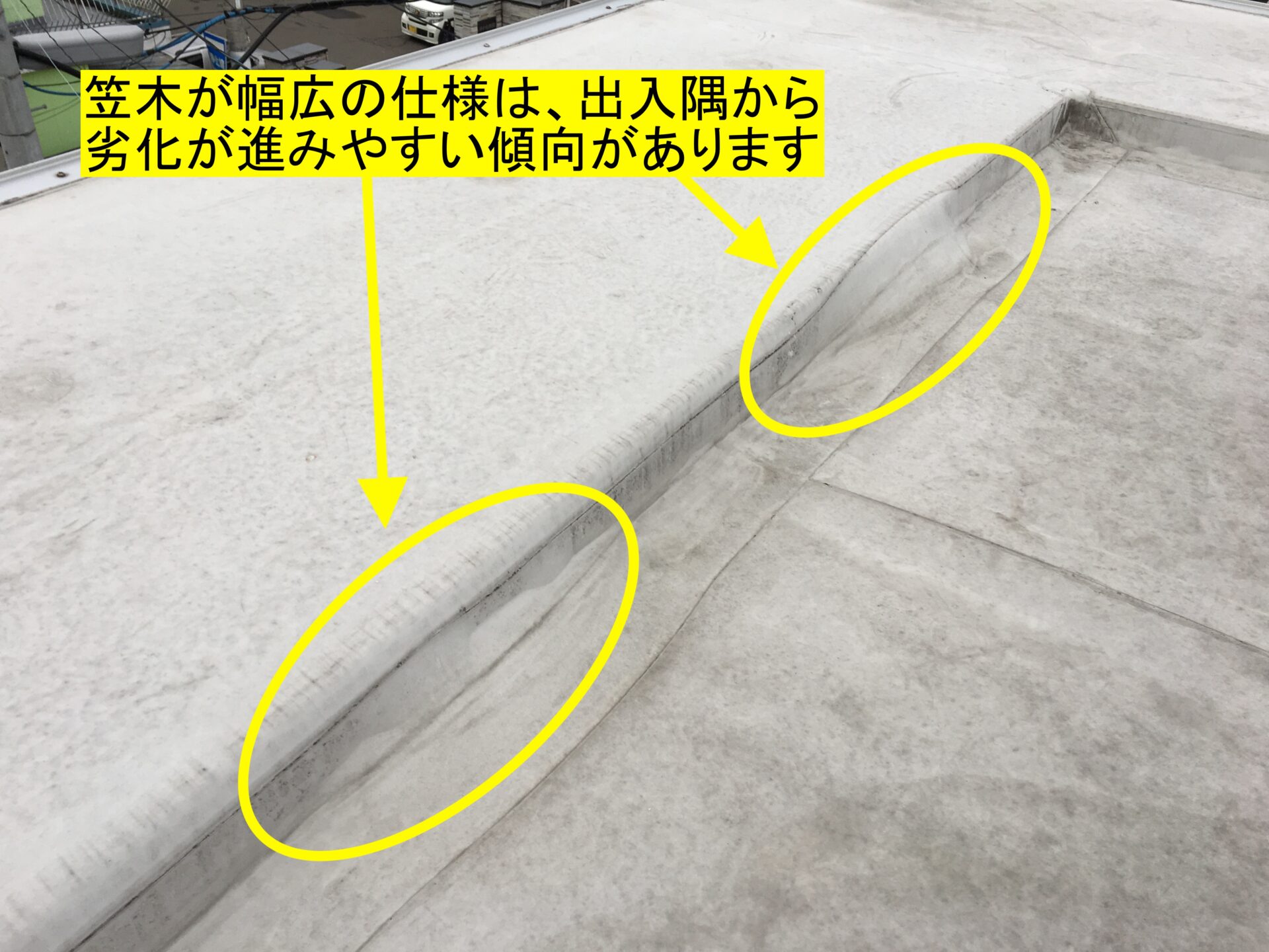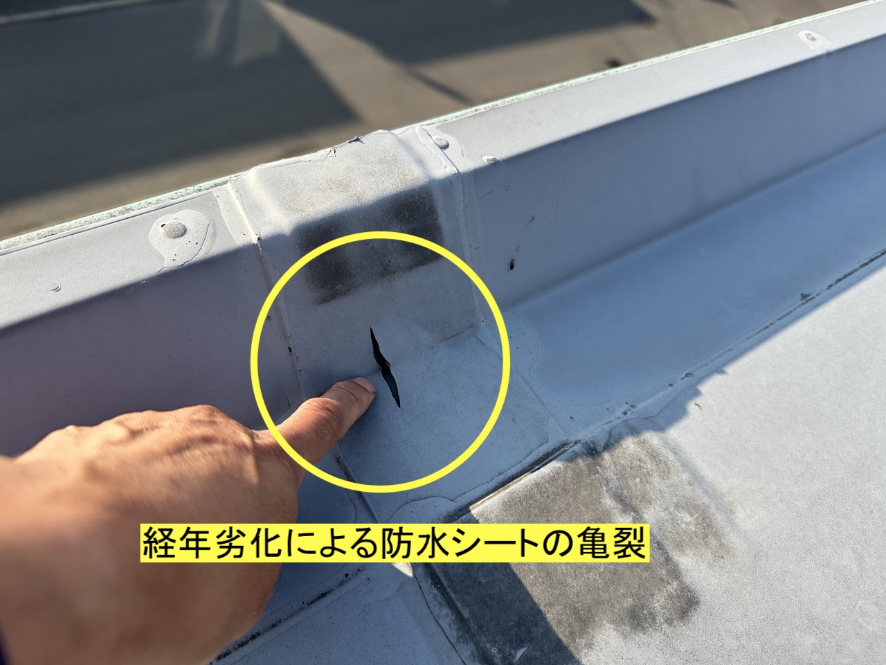 幅広笠木は出入隅(角)から劣化しやすい仕様です。屋根防水15年以上経過は症状がなくても定期点検を。放置すると破断は突然起こることがあります。