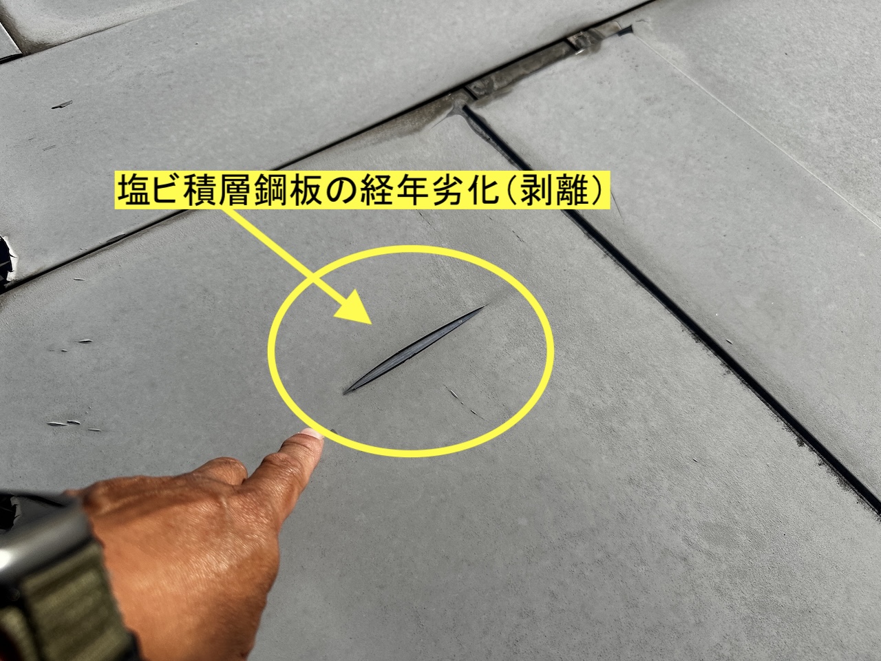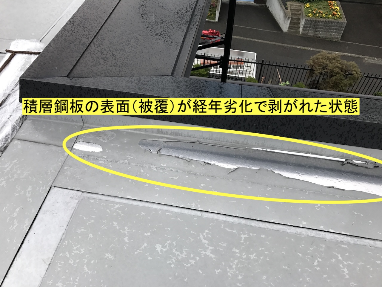 - 経年劣化が進むと各所で塩ビ積層鋼板の被覆剥がれや浮きなどが目立ち始めます。