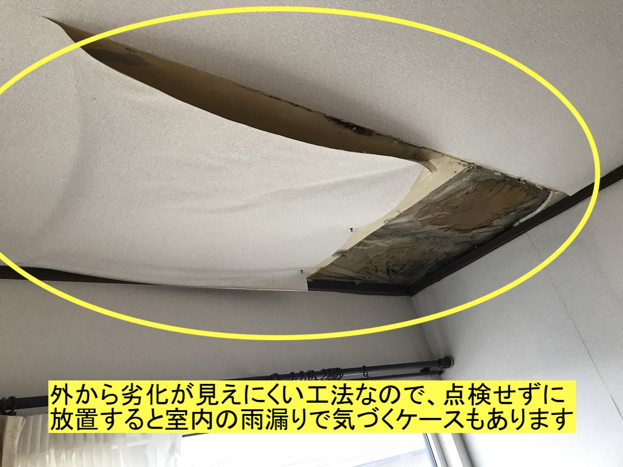 鋼板防水は目視のみでの劣化判断がしづらい工法です。雨漏りしてからご相談をいただくケースも多く、定期的な点検をお勧め致します。(総合的な判断が必要)