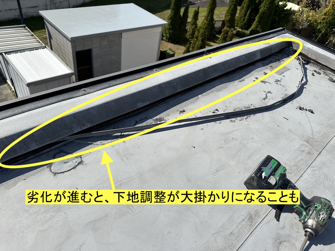 - 帯状鋼板を上から重ねている仕様は、継ぎ目の下で劣化が進んでも外観だけでは分かりにくいことがあります。原因をはっきりさせるには、必要に応じて一部をめくって確認します。