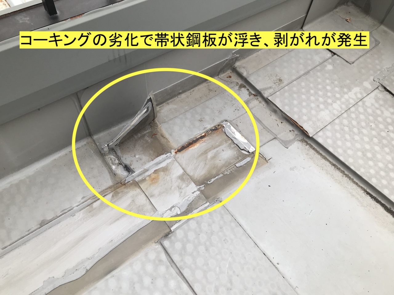 被覆=防水層となりますので、被覆の状態をこまめに点検するのがこの仕様の雨漏りを防ぐポイントです。 - 帯状鋼板の段差(重ね)は水が引っ掛かり、汚れが溜まりやすい構造です。帯状鋼板まわりの劣化には要注意です。