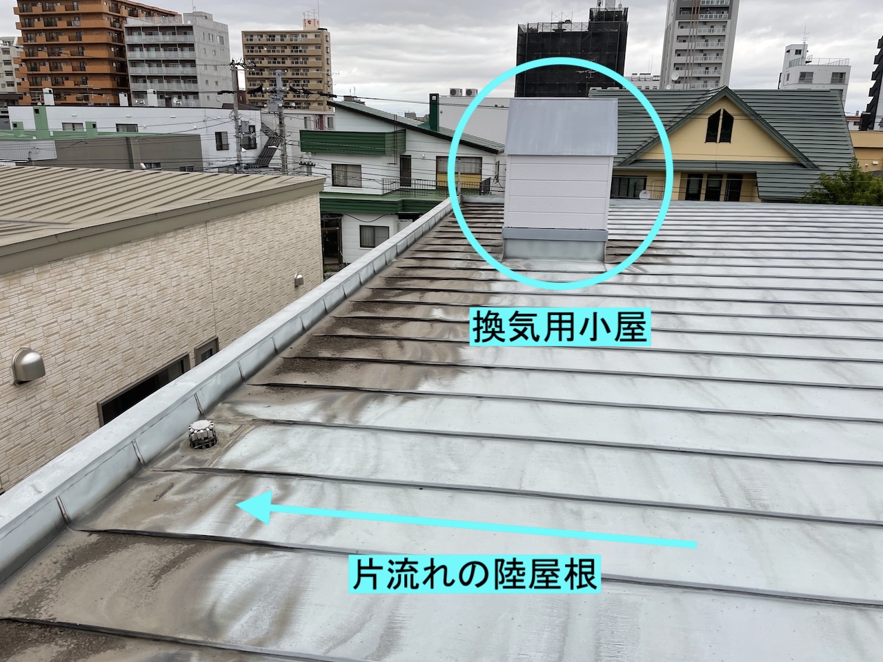 - 屋根全体のゆるい勾配(面)で水を流す設計になっています。