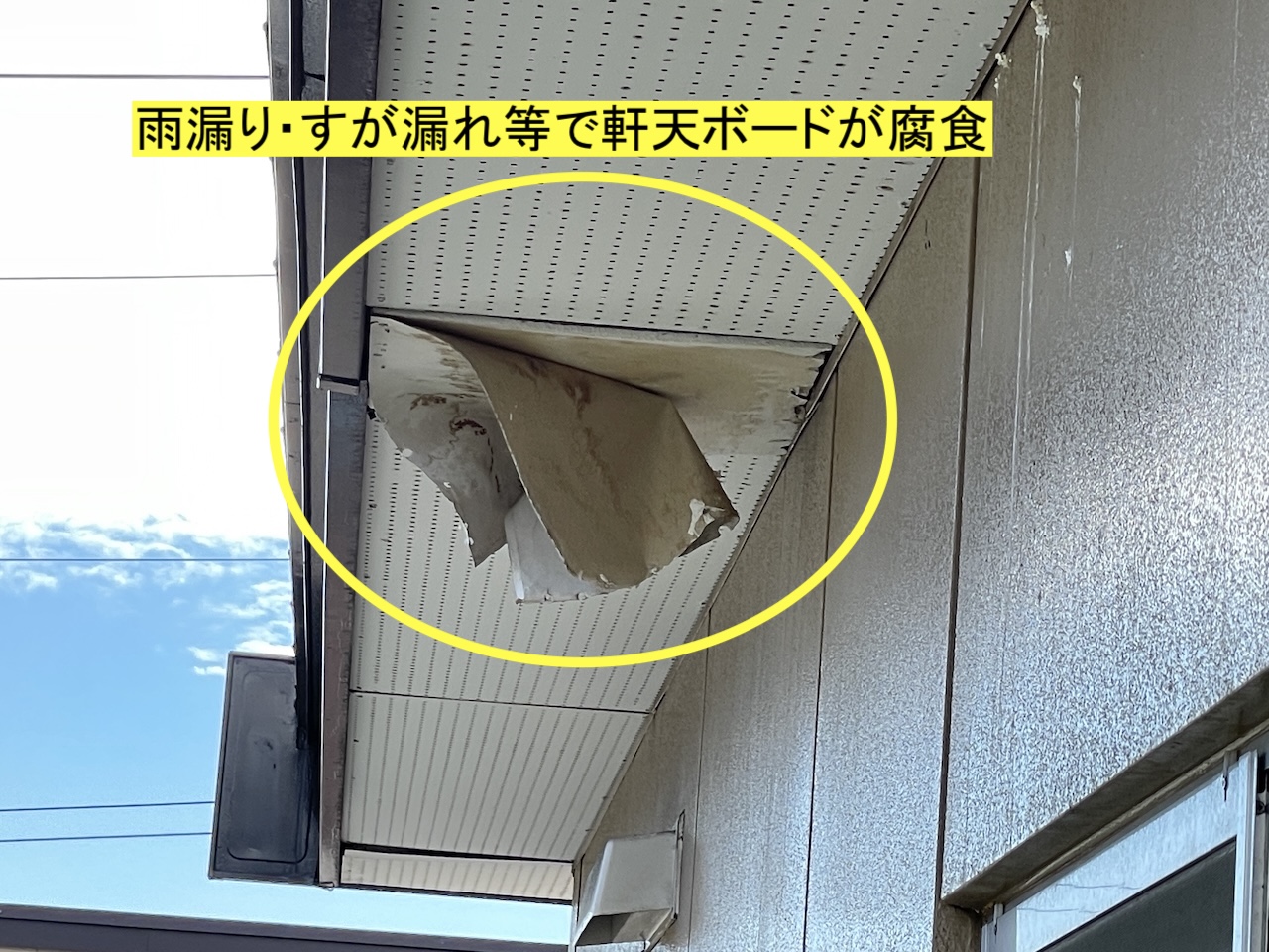 - 雨漏りや“すが漏れ”が起きると、軒天ボードが腐食・剥がれに進行することがあるので、軒天の変色や浮きもチェック。