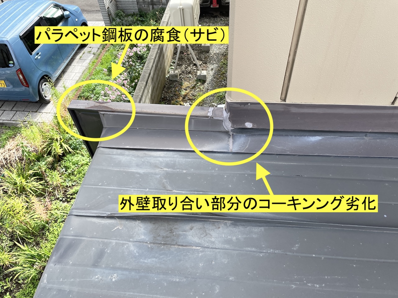 - パラペット鋼板はサビやすいポイント。端部・継ぎ目・水が当たる場所の変色(サビ汁)は劣化サイン。