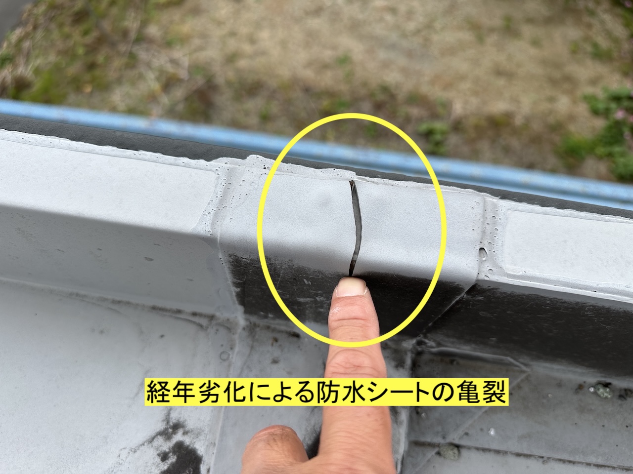 - 外周端部に防水シートの亀裂がある場合は、雪解けが一気に進む時期に突然雨漏りするケースもございますので、雪が降る前の点検がおすすめです。